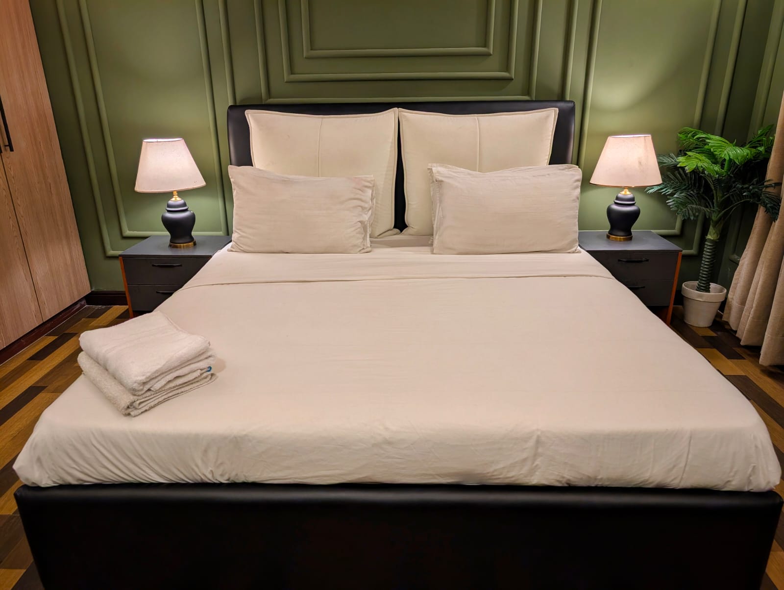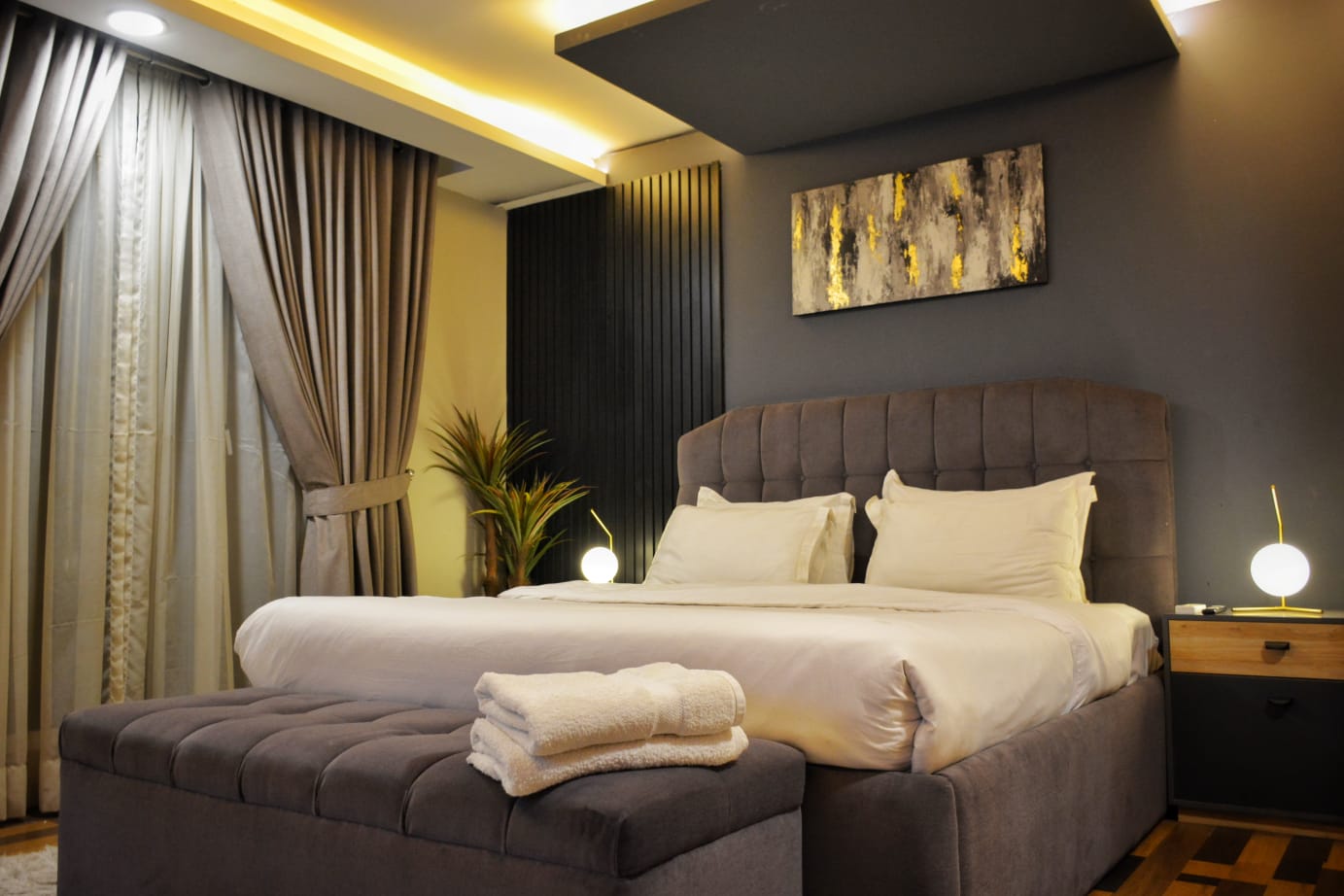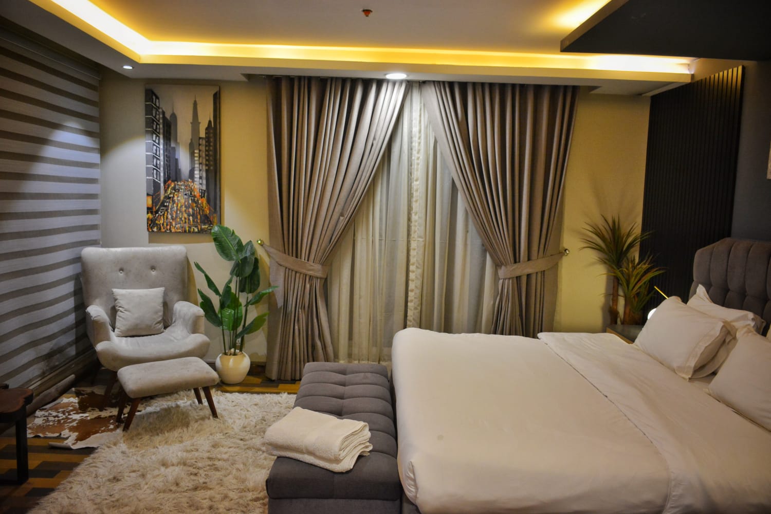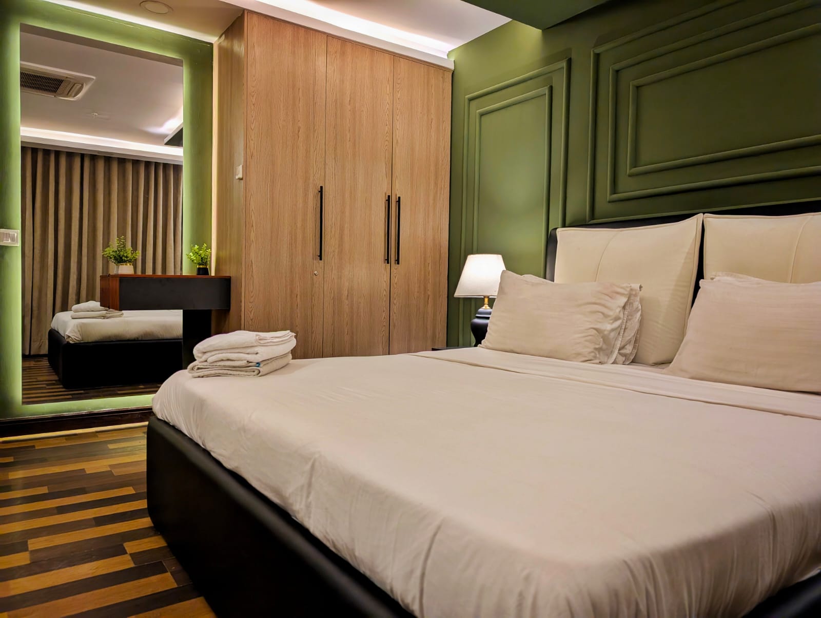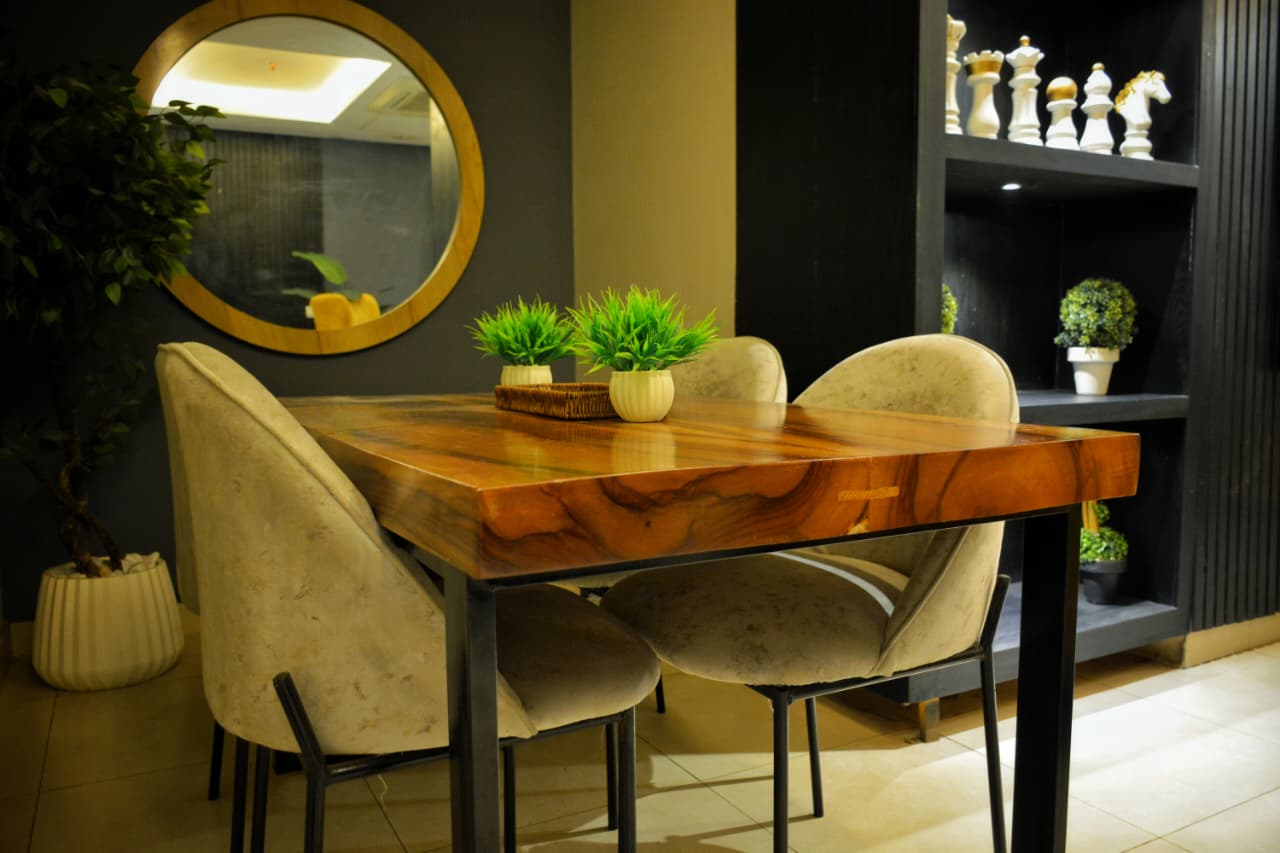 At Alvis Suite, we believe your stay should feel like an upgrade. Our Luxury One-Bed at Zameen Opal is designed for guests who are tired of basic hotel rooms and want a space with actual personality. With its signature black-themed interior and custom lighting, this suite offers a bold, executive feel that stands out the moment you walk in.